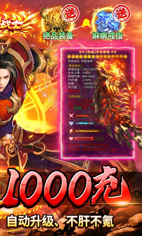 1、红包福利:每天登录游戏免费领取1000红包,激活线上累充 2、上线福利:开局赠豪华礼包,属性大幅提升 3、真充福利:创角签到送真充卡,激活商城积分累充活动 4、自动升级:免费泡点自动升级,不肝不氪,解放双手 5、百万货币:零氪玩传奇,打怪领充值卡、百万元宝、沉默币 6、超值回收:极品装备官方回收,万元首爆疯狂送 7、超高爆率:所有道具全靠打,小怪也能爆神装